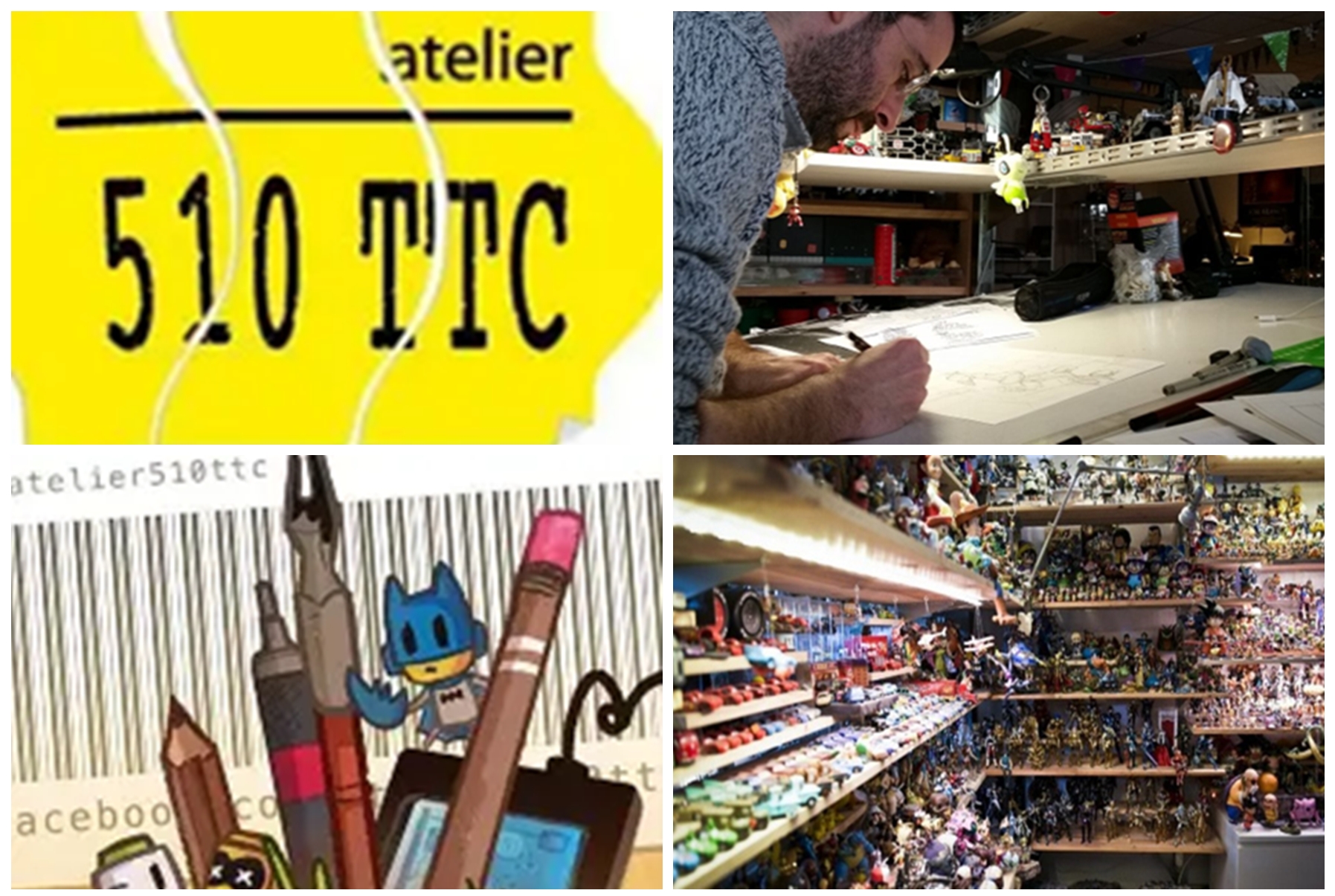 Créé en 1994 à Reims, « l’Atelier 510 TTC » compte une dizaine de membres et loue un premier local dans un entrepôt pour un montant de 510 Francs TTC. C’est au montant de ce premier loyer que l’atelier doit son nom.Dans cet atelier au « look un peu singulier » avec des étagères partout, remplies de jouets (figurines, Lego…), avec des plantes…, chaque artiste a son espace personnel – certes un peu restreint - avec table à dessiner et ordinateur.