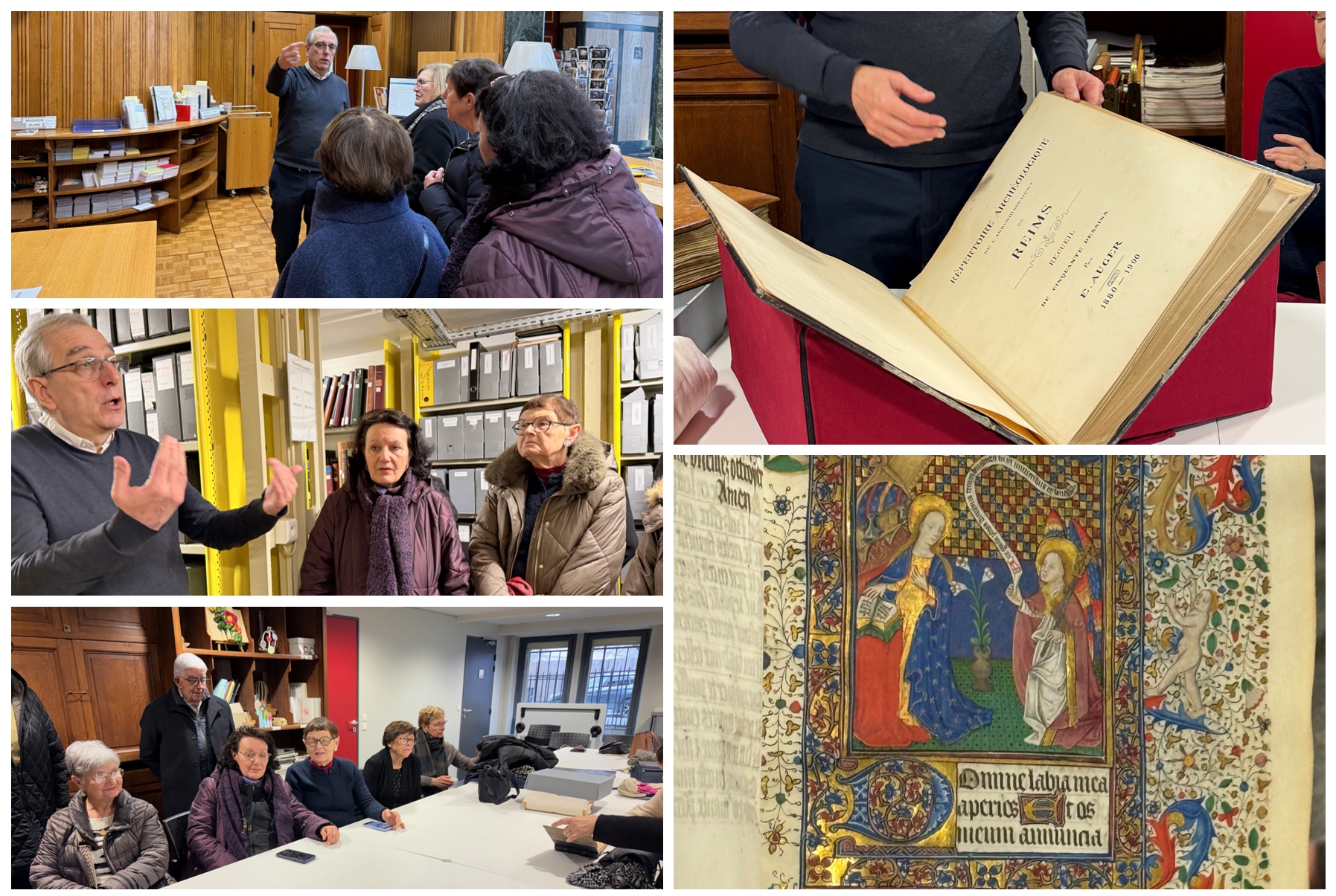 Descendus au sous-sol dans la Réserve, nous avons eu le privilège de découvrir des ouvrages anciens rares et précieux, conservés entre 18 et 20° à 50 % d’hygrométrie. Ce fonds essentiellement religieux provient des abbayes, des chapitres, des collèges, pillé puis rassemblé pendant la Révolution, puis l’Empire, dans les premières bibliothèques publiques. Les plus vieux ouvrages datent de l’époque carolingienne. Monsieur Galaud nous a présenté deux manuscrits en parchemin et enluminés - un évangéliaire de 1050 - un livre d’heures du XVe, puis un incunable rare (une affiche sur papier de la même époque) – un récit de voyage inédit du XVII, manuscrit ! Nous découvrons ensuite un des premiers livres imprimés à Reims grâce à l’archevéché, une Bible de 1550 ! Puis des ouvrages illustrés plus récents, offerts à la ville ou achetés, des épreuves du legs Fujita, un recueil de poésies de PJ Jouve illustré par J Sima, un petit almanach parodique du Père Ubu, un album de photos rares de la ville de Reims entre 1914 et 1918 avec ses plaques …