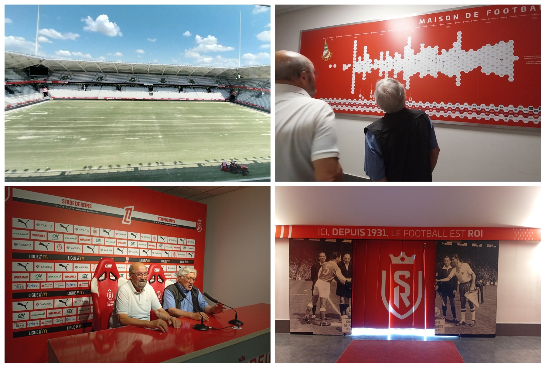 Notre visite a eu pour but de nous faire découvrir les locaux non visités par le public habituel du stade. Nous avons commencé du haut en bas : Quatrième étage où se trouve le PC sécurité qui est ouvert bien des heures avant le match. De là, nous avons pu admirer la pelouse (deuxième plus belle pelouse de France) ainsi qu’un point de vue sur les tribunes (la tribune Jonquet celle des supporters de l'équipe de Reims). Le troisième étage est réservé aux journalistes et à la presse. Les loges VIP occupent le deuxième étage (entreprises et bien sûr maisons de Champagne). Ensuite nous avons visité les vestiaires au rez -de- chaussée et le sous-sol où se trouve le salon des conférences de presse.
